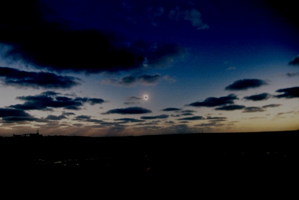 A wide angle view of the sky at totality. Ceduna's wheat mill is to the bottom left and some cloud shadows are seen near the horizon.